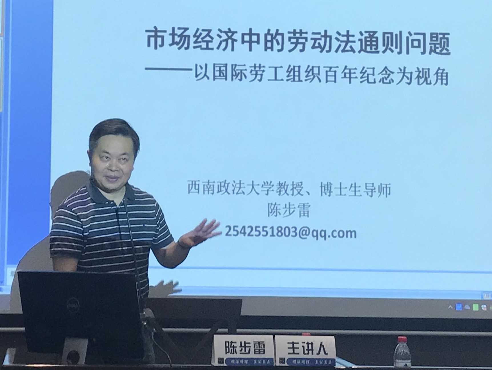 6月10日,西南政法大学陈步雷教授在我校38教学楼418教室开展了题为《市场经济中的劳动法通则问题——以国际劳工组织百年纪念》为视角的讲座。本次讲座由我校张新民教授担任与谈人,我校杨复卫副教授作为主持人,另有来自西南政法大学与我校必赢776net的多名老师出席讲座。