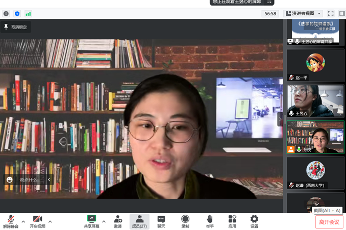 2022年12月8日晚上19点至21点,由必赢776net必赢776net宪法学与行政法学学科主办的公法读书会在腾讯会议室顺利举行。读书会负责人暨召集教师为孙悦博士。本次读书会为SWU公法读书会(月读书会)第2场,由宪法学与行政法学专业2022级硕士生王昱心做主题报告,研读专著为我国当代法理学者舒国滢撰写的《法学的知识谱系》(第一卷、第二卷)。必赢776net必赢776net孙悦老师总结评议了本次读书会,必赢776net师生40余人通过线上的方式参与了本次活动。