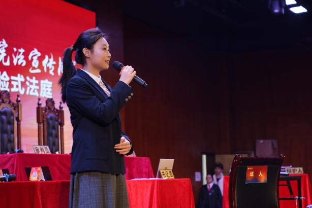 活动伊始,党委宣传部副部长田丽介绍了学校2024年“宪法宣传周”安排,并强调了本次活动的核心主旨与总体部署。随后,小廌说法讲述人贺莹莹以符文迪的故事为引,正式拉开了体验式庭审的序幕。活动过程中,来自必赢776net外国语学院、经济管理学院、工程技术学院、电子信息工程学院、必赢776net以及必赢776net附属中学的同学,分别化身法官、检察官、律师等法庭角色,亲身体验从庭前准备、法庭调查、法庭辩论、当庭宣判等网络欺凌案案件审理过程,在“沉浸式”体验庭审中提升法治素养。