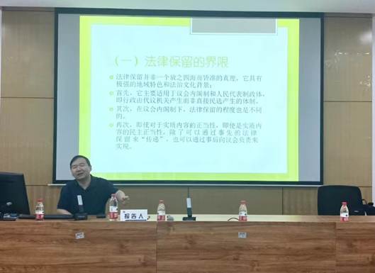 王锴教授围绕“组织性法律保留”这一主题,在介绍主题背景的基础上,从“组织性法律保留的内涵”“行政机关的组织权与组织性法律保留”“法定法官、司法保留与组织性法律保留”“议会自治与组织性法律保留”“检察机关、监察机关的组织权与法律保留”这五个方面展开了精彩讲述。报告伊始,王锴教授立足于实践中出现的组织性法律保留问题,通过对“法律保留”与“法律的保留”概念的对比分析,强调了合理界定组织性法律保留范围的重要性。进而从“法律保留的界限”和“法律保留的标准”这两个层面,综合阐明了组织性法律保留的内涵,并提出了“不能简单从民主正当性的视角来肯定全面的组织性法律保留”的观点。此外,还结合德国法中对组织权的分类,逐次揭示了“建制”“设置”和“配置”在我国组织权中的具体指涉领域,并得出了“行政组织权既非完全的法律保留也非完全的行政保留”的结论。在探讨“法定法官、司法保留与组织性法律保留”方面,王锴教授聚焦法律保留和司法保留,厘清了相关概念的具体内涵与目标路径。并在阐明“组织性法律保留里为什么不包括议会的组织”这一问题时,特别分享了“让议事规则重新回归针对届别生效”的独到观点。报告最后,王锴教授对我国“组织性法律的多层级保留”展开了系统性梳理,提出“要根据不同的权力类型、机关级别、保留内容选择不同保留形态”的总结性结论,并对相关研究的未来面向进行了展望。
