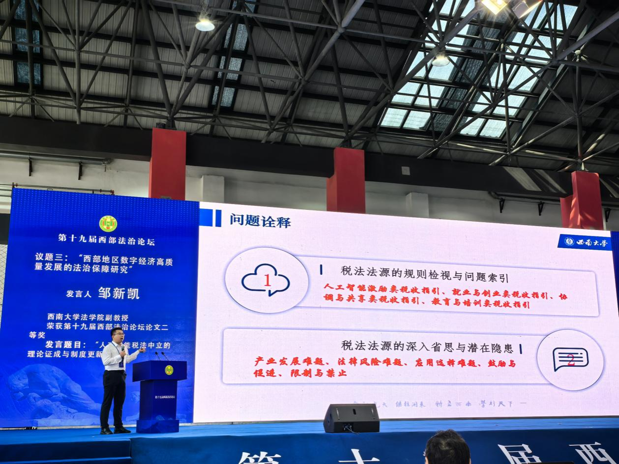 邹新凯老师作为“西部地区数字经济高质量发展的法治保障研究”单元的主题报告人之一,以《人工智能税法中立的理论证成与制度更新》为题,认为当前税法规制人工智能的核心理念对人工智能与人类日益突显的竞争关系缺乏正视与考量,论文提出人工智能与人类在完成相同经济社会任务时应总体保持均衡税负,国家应对竞争劣势方予以特别税收支持,意在以二者税法规制均衡最终促成法律规制均衡,从而推动市场主体越发只依据人工智能与人类的内在属性及其机能自主决定使用比例,减少公权力强制干预。
