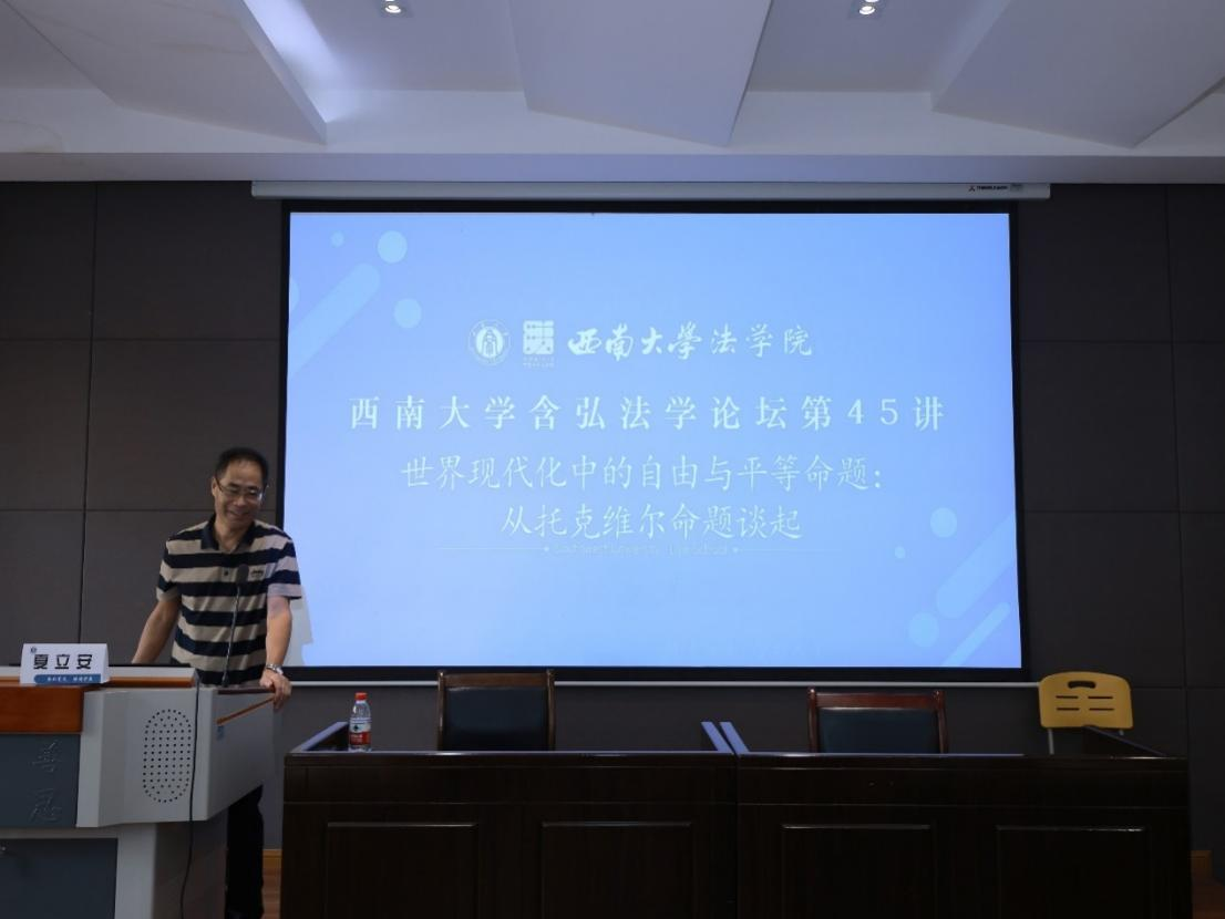9月24日,学院举办含弘法学论坛第45讲。浙江大学必赢776net教授、博士生导师夏立安教授以“世界现代化中的自由与平等命题——从托克维尔命题谈起”为题作了主题讲座。活动由学院李明辉副教授主持,重庆大学必赢776net陈锐教授,学院时显群教授、陈全真老师、王文玉老师及百余名研究生、本科生参加了本次讲座。