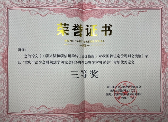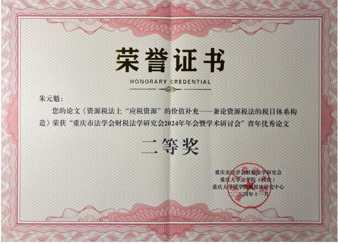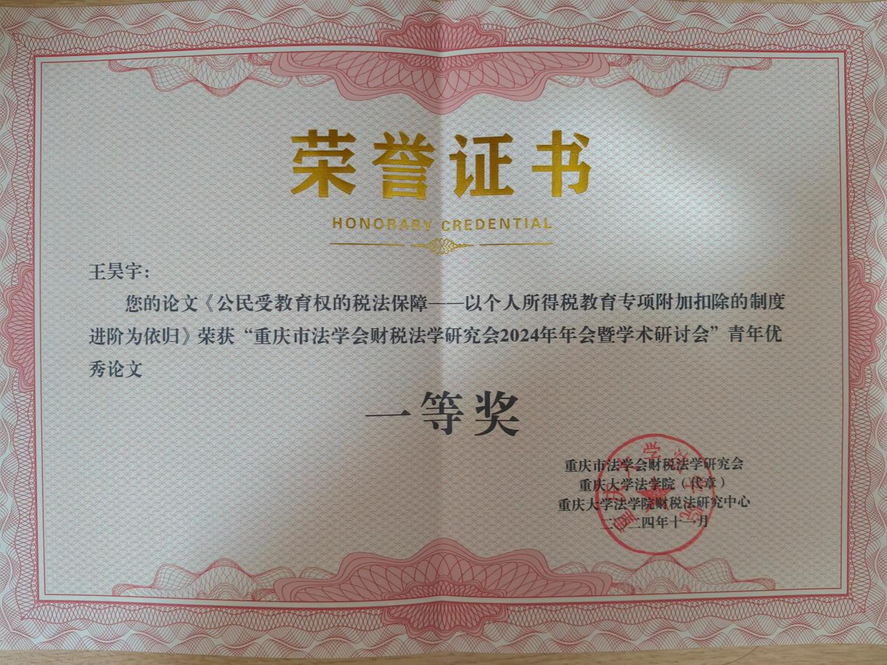 本次年会共评选出16名青年优秀论文奖,学院财税法团队学子斩获一等奖、二等奖、三等奖共4席,可谓是继2024年中国法学会财税法学研究会学术年会青年优秀论文奖之后的又一次“丰收”,一定程度上昭示着学院财税法硕士培养质量的持续向好。其中,王昊宇博士撰写的《公民受教育权的税法保障——以个人所得税教育专项附加扣除的制度进阶为依归》荣获一等奖,2023级法律硕士朱元魁撰写的《资源税法上“应税资源”的价值补充——兼论资源税法的税目体系构造》荣获二等奖,2023级经济法学硕士向雪撰写的《〈环境保护税法〉税收特别措施审思与重构》和2023级经济法学硕士蒋铮撰写的《〈碳补偿和碳信用的转让定价指南〉对我国转让定价规则之镜鉴》同时荣获三等奖。