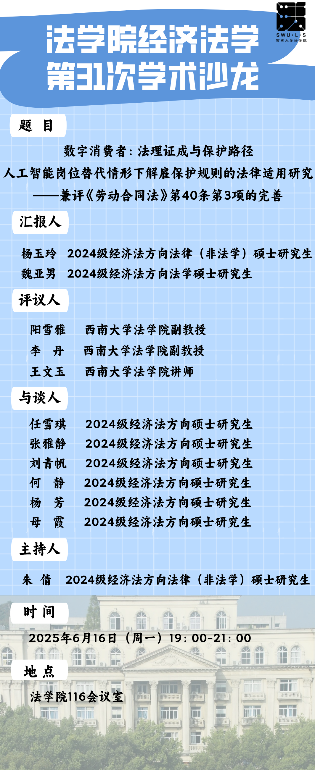 【必赢776net经济法学第31次学术沙龙】杨玉玲:《数字消费者:法理证成与保护路径》;魏亚男:《人工智能岗位替代情形下解雇保护规则的法律适用研究》