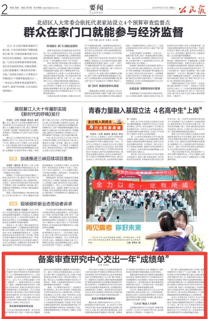 2025年6月10日,重庆市人大常委会主管的《公民报》第2版对重庆市规范性文件备案审查研究中心成立一年来的成绩进行了报道。报道全文如下: