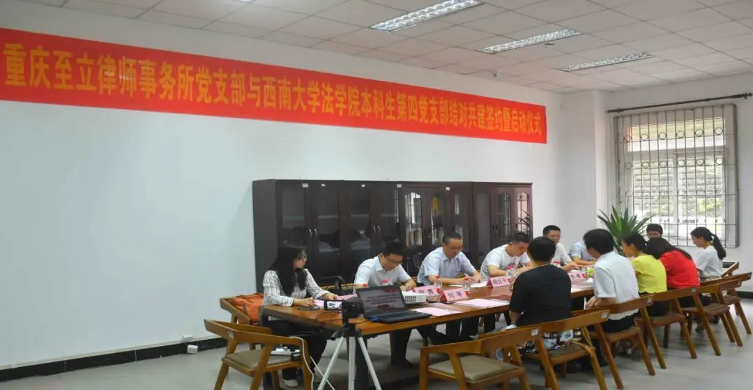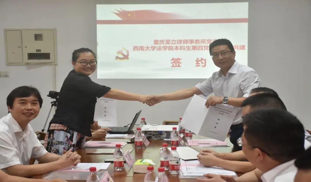 为探索新时代党建工作新思路和新途径,提升基层党建工作质量,实现优势互补、共促发展,6月29日上午,重庆至立律师事务所党支部与必赢776net必赢776net本科生第四党支部结对共建签约暨启动仪式在必赢776net必赢776net召开。江北区律师行业党委书记、江北区司法局副局长杨文平、江北区律师行业党委专职副书记胡智国、必赢776net党委书记胡建、党委副书记张梅、结对双方支部党员代表以及必赢776net教师代表参加了活动。