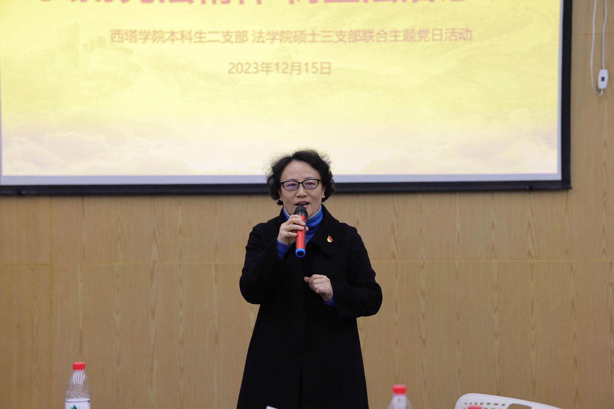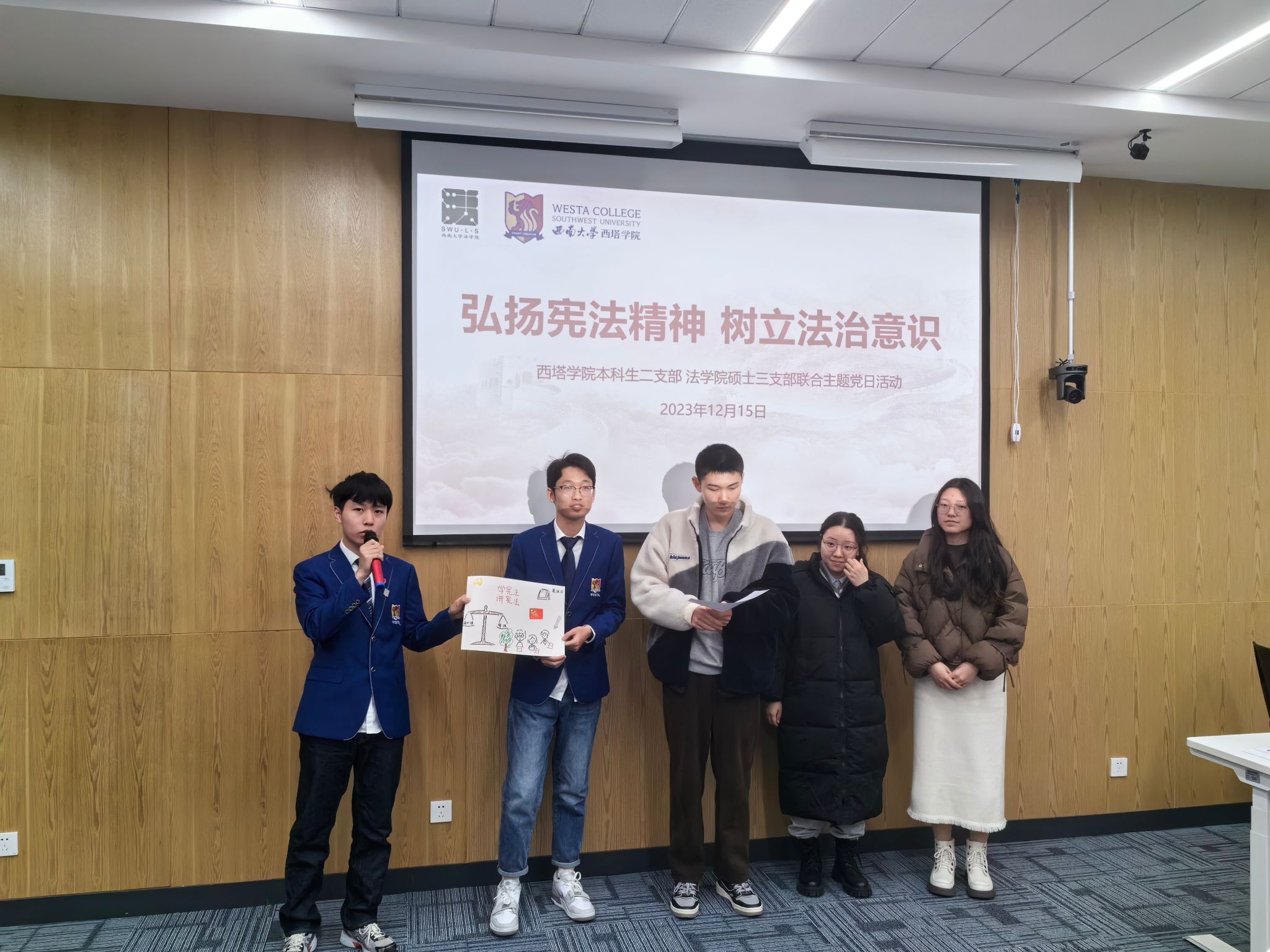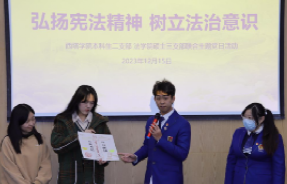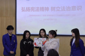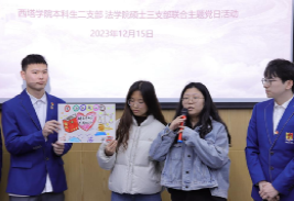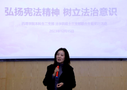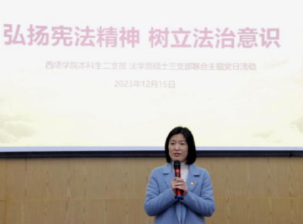 12月15日下午,法学硕士第三党支部与西塔学院本科生二支部联合开展“弘扬宪法精神,树立法治意识”主题党日活动。学校财务处副处长陈建英、西塔学院党委书记王静、法学硕士第三党支部书记周海华出席,两个支部的全体党员和部分积极分子参加。活动由西塔学院团委书记、学生办公室主任兼本科生二支部书记李杨主持。