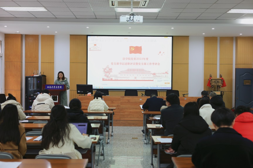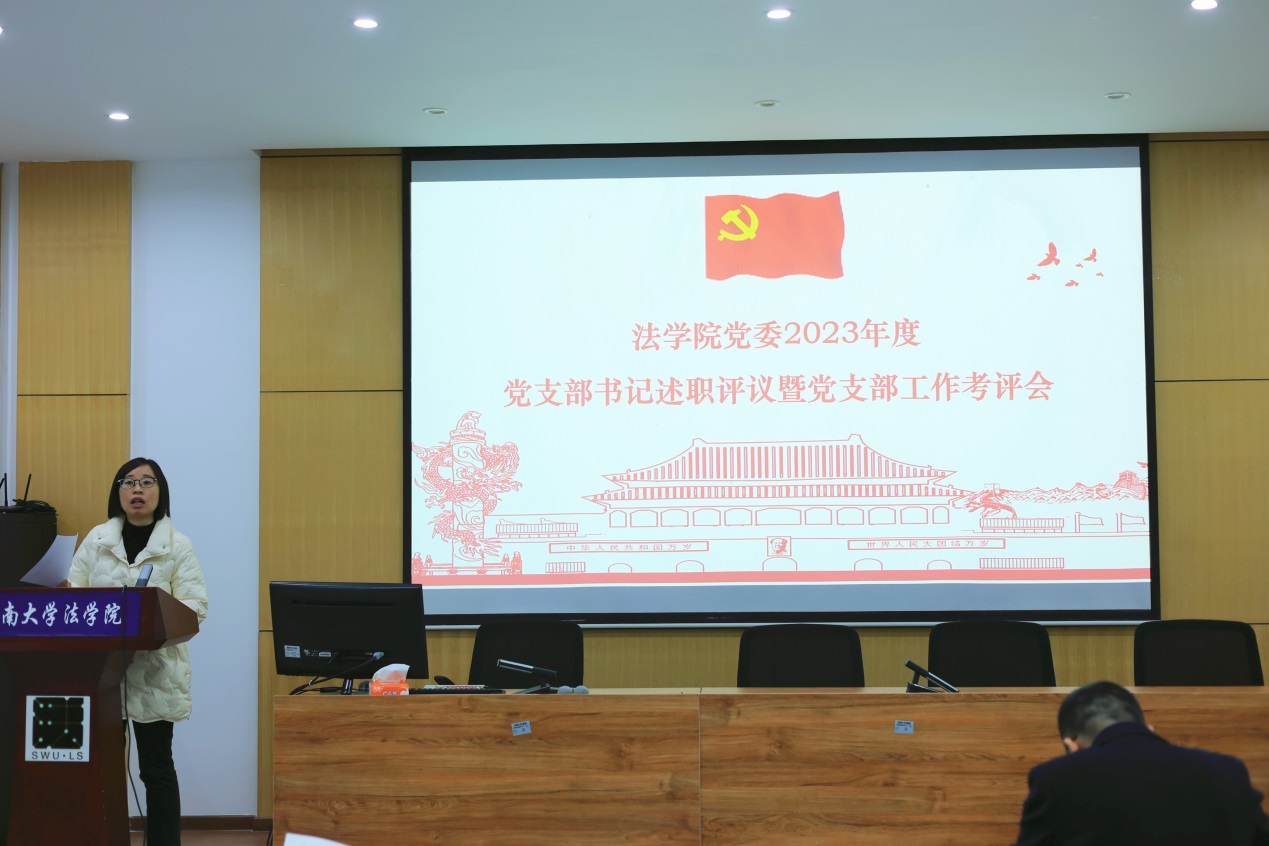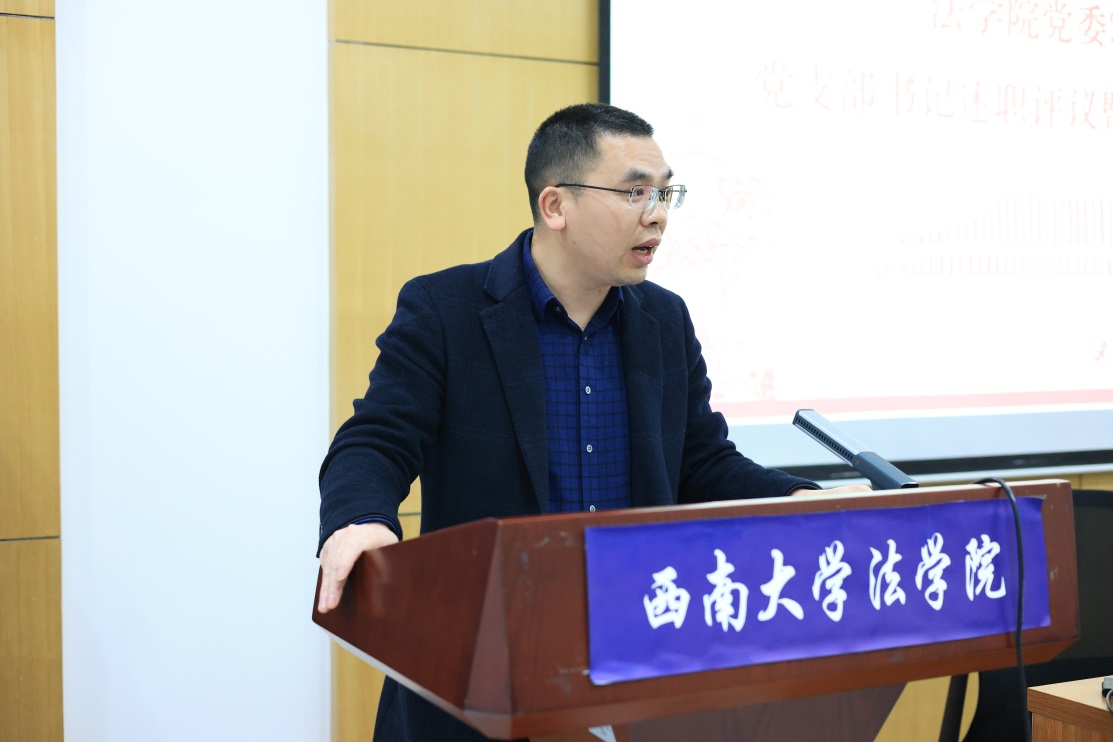 会上,学院12名党支部书记逐一述职,回顾了一年来的具体履职情况,就各自支部工作成绩中创新之处进行了汇报,同时结合实际深入分析了支部工作中现存的问题及其原因,并针对性提出对应的改进措施以及下一步工作计划。叶金育院长就述职情况进行了点评,对教师党支部在教学科研、三下乡志愿服务等方面发挥的先锋模范作用表达了高度认可,对学生党支部在专业竞赛、学风建设中取得的成绩予以肯定,对廌鸣法律社党支部打造的党建品牌特色给予了高度赞扬,对各位支部书记辛勤付出表示了衷心的感谢,并指出了支部发展中存在标志性成绩不突出、部分支部工作不规范、学生积极主动性不足等共性问题,同时结合问题就下一步工作提出了具体要求。与会人员认真听取述职发言,并进行了现场测评。