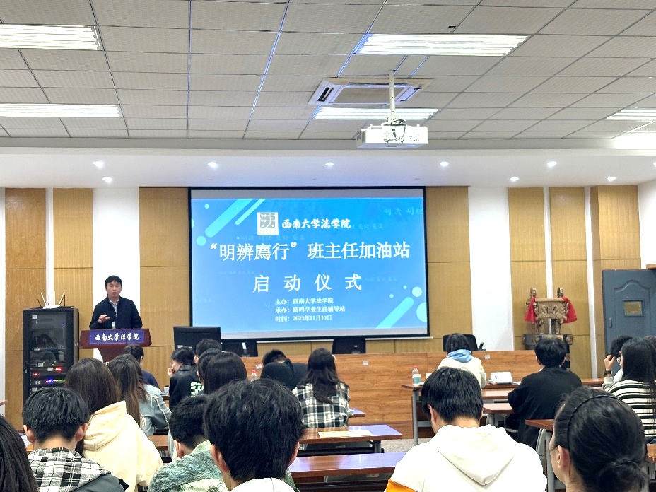 活动伊始,学院党委书记胡建致辞。他指出,举办本次班主任加油站活动是为了加强学院学风建设,解决学院学生需求,促进师生交流,引领学生全面发展,学院精心准备与酝酿而成。对此,他对大家提出了期望和要求,希望班主任老师认真准备潜心教书育人;希望同学们积极参与,提高自身素质与生涯规划能力,努力成长为德才兼备的新时代法学人才;希望学工老师们认真筹备,做好服务与管理工作,并表示学院党委将大力支持本次活动开展,营造良好学院氛围。