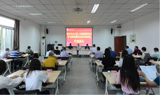 重庆合川区人民检察院党组书记、检察长杨洪广指出本次培训班的母的是为了以优异成绩迎接建党一百周年,深入学习领会习近平总书记重要讲话精神,切实增强“四个意识”、坚定“四个自信”、做到“两个维护”,提高思想认识和政治站位,抓好合川区人民检察院的学习教育工作。