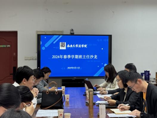 为进一步落实立德树人根本任务,加强班主任队伍建设,凝聚育人合力,增强育人实效,加强学院学风建设,培养德才兼备的新时代法学人才,4月11日下午,学院2024年春季学期班主任沙龙在38教116室举行。学院党委副书记张梅、副院长邹兵、副院长范卫国、本科生各年级班主任、辅导员参加会议,会议由党委副书记张梅主持。