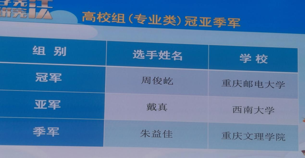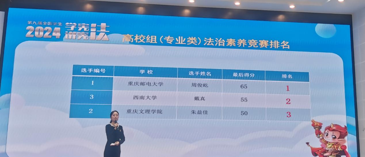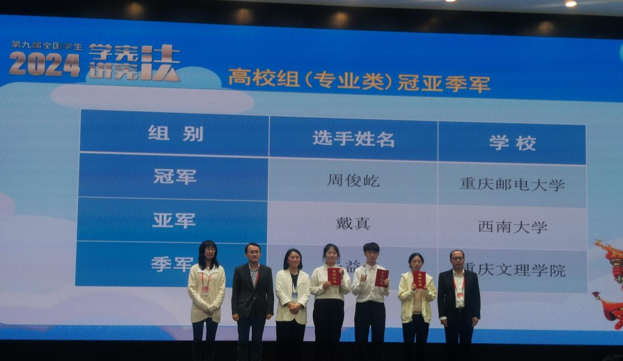 11月10日,第九届全国学生“学宪法·讲宪法”重庆赛区决赛圆满落下帷幕。本次比赛由重庆市教育委员会主办,九龙坡区教育委员会、重庆市谢家湾学校承办,分演讲比赛和法治素养竞赛两个赛项。该活动今年8月启动,经过层层选拔,共有84名中小学生和42名高校学生入围决赛。学院本科生2023级戴真同学获得法治素养竞赛高校组(专业类)亚军。