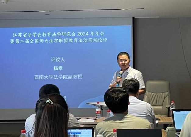 2024年6月9日,杨攀副教授受邀参加江苏省法学会教育法学研究会2024年年会暨第二届全国师大法学联盟教育法治高端论坛。本次会议由江苏省法学会教育法学研究会主办,江苏师范大学人文社会科学研究院、教育科学学院、必赢776net、徐州市法学会、东南大学人权研究院承办。全国近二十个省(市)的180多名专家学者、法律实务工作者等,围绕教育法学学科建设与人才培养、法治中国与高等教育治理法治化、青少年法治教育与中小学依法治校、人工智能教育立法与教育法典编纂等主题展开广泛与深入的研讨。杨攀副教授在第四分论坛“人工智能教育立法与教育法典编纂问题”担任与谈人。