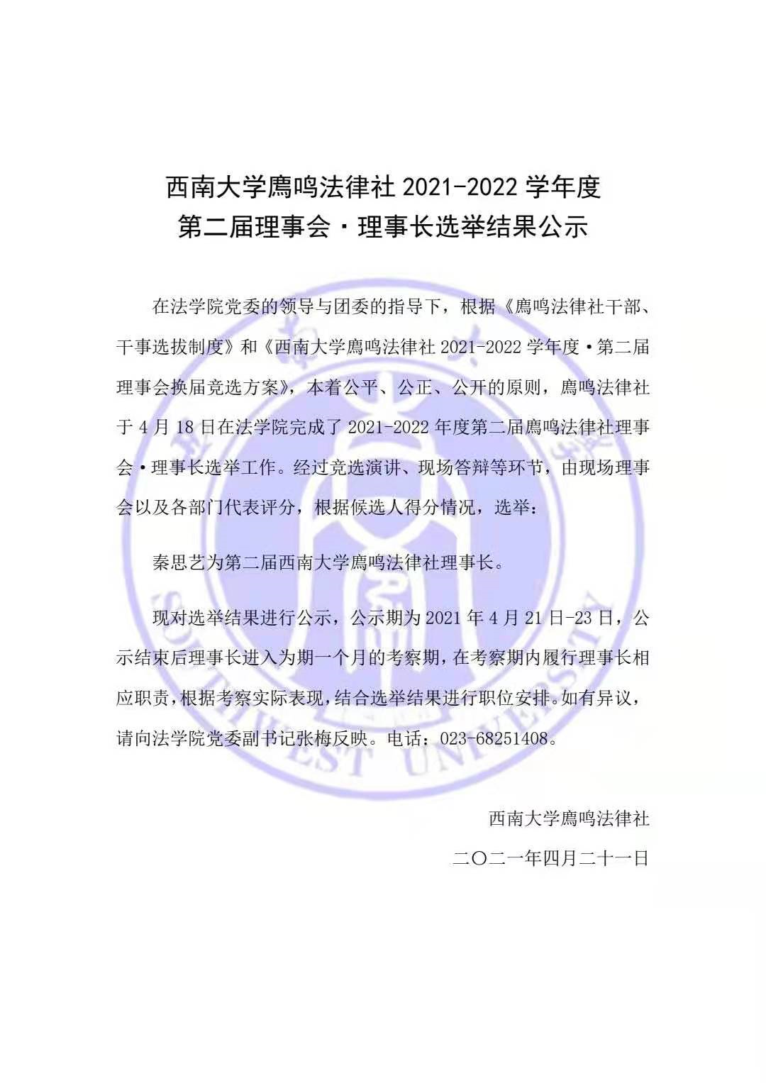 必赢776net廌鸣法律社2021-2022学年度 第二届理事会·理事长选举结果公示
