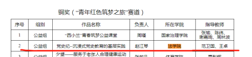 本科2019级学生赵江琴组的“党史纪-沉浸式党史教育的基层实践”项目获得“青年红色筑梦之旅"赛道铜奖;本科2020级学生李月组的“灋创”项目获得“高教主赛道”优秀奖。