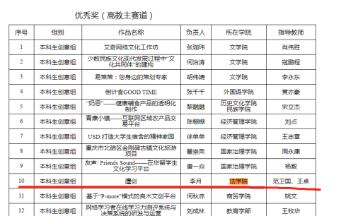 最终,在全校近900个项目中,由范卫国老师、王卓老师指导的本科2019级学生赵江琴组的党史纪-沉浸式党史教育的基层实践项目获得学校互联网+创新创业大赛"青年红色筑梦之旅"赛道铜奖;本科2020级学生李月组的灋创项目获得学校互联网+创新创业大赛高教主赛道优秀奖。