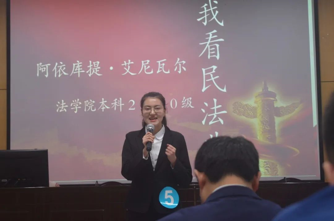 崇学正行,至善臻美。从修典立法到普法执法,本科2018级的贾铠桦同学在《愿以吾辈之青春,护卫法治之中华》中阐述了法律人的意义;《执子之手,拥抱法典》中,来自本科2019级的孙志筌同学从《民法典》的实用价值和公民的幸福指数两个角度诠释了《民法典》的意义;本科2020级的郝晨仪同学带来了《以我之声,传奏民法典之声》,阐述了新时代立法对“人”的高度关注、深切关怀;在《法治之声,民法传响》中,本科2020级的蔡源美同学将《民法典》的编撰历史娓娓道来;本科2020级的阿依库提·艾尼瓦尔同学在《我看民法典》中讲到《民法典》从立法到颁布再到最后实施,都是中华民族精神的体现。选手们动情入理的演讲感染了在场各位,使各位观众对《民法典》、对法学有了更深的体悟。
